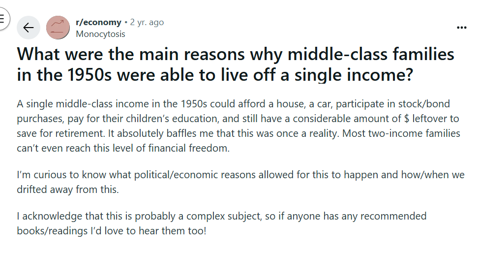 在 Reddit 上,有网友提问:为什么上世纪 50 年代的美国中产,凭借一己之力就能养活全家、供房供车、供子女的教育、还能存下养老钱?现在的中产阶级,双职工家庭都达不到这种财富自由?
