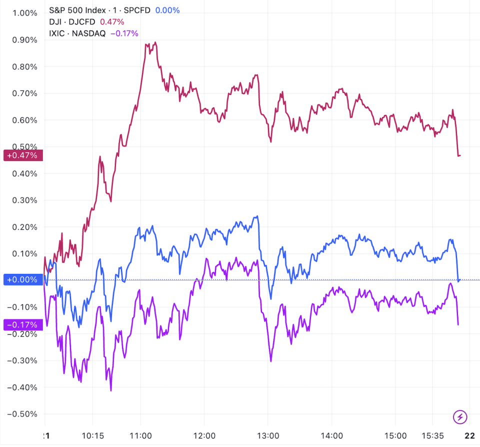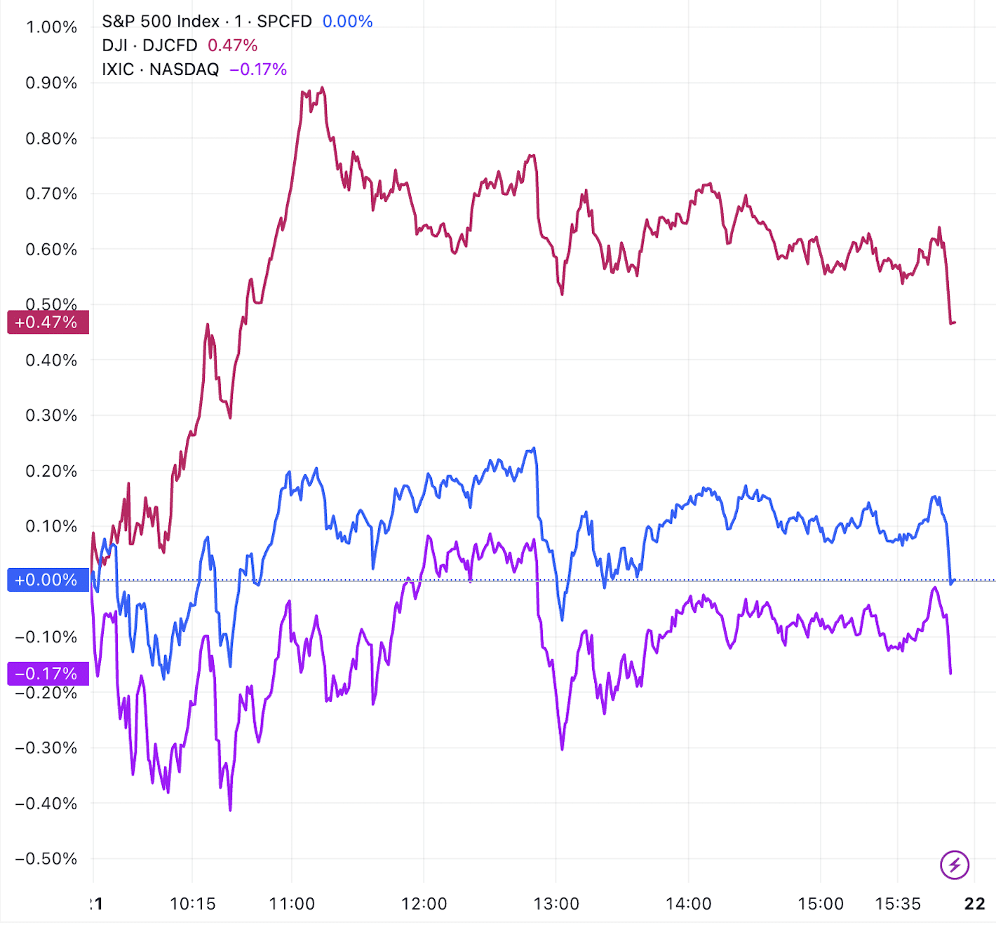 截至收盘,道琼斯指数涨 0.47%,报 46,924.74 点;标普 500 指数平收,报 6,735.35 点;纳斯达克指数跌 0.16%,报 22,953.67 点。