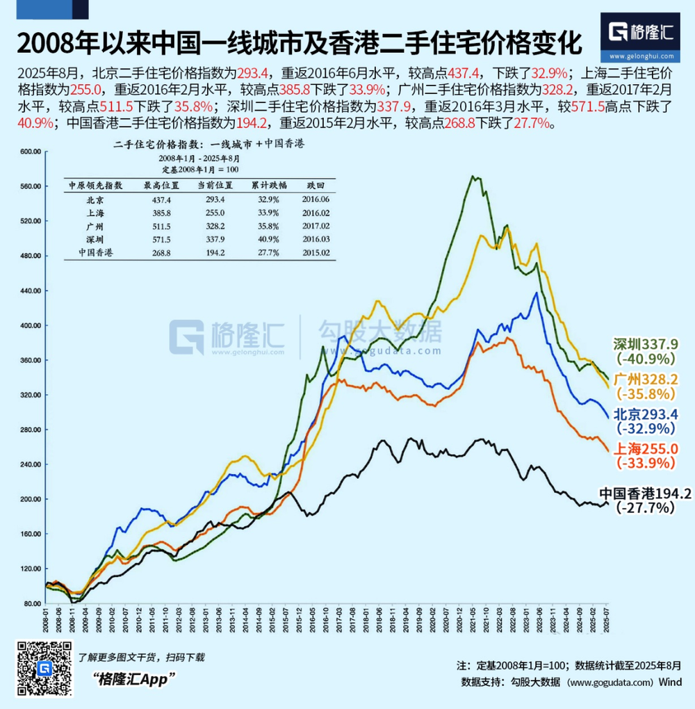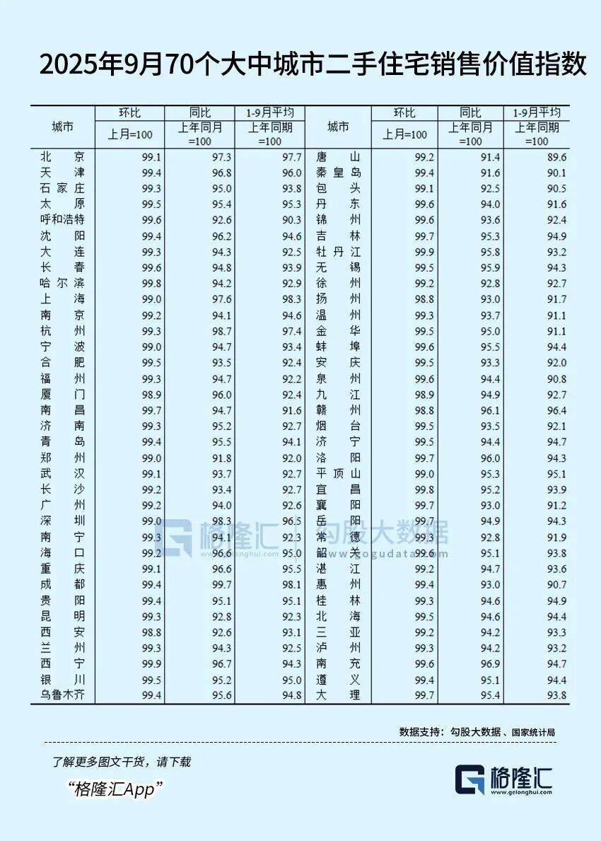 9 月官方统计的数据如下图,70 个大中城市二手房清一色环比下跌,去年 9 月底以来的一波涨幅已经完全掉回去还有余。像北京环比 8 月跌了 0.9%,上海跌了 1%,深圳跌了 1%,这个幅度是不低的,年化相当于跌了 10 几个点,而房子又是家庭仓位比较重的资产。虽然有人说,只要我不卖,我就没亏。但它就是代表着你的储蓄在缩水,会影响居民对未来的预期。