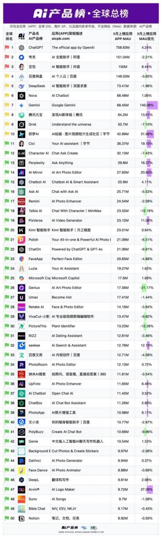 这种形势与全球市场截然相反。全球总榜上,34 个非中国产品里只有 5 个属于 「大厂」,占比约 15%,除 Gemini(Google)、Grok(X)、Character.AI(Google) 和 Microsoft Copilot 外,其他几乎全是来自小团队或创业公司。如排名第一的 ChatGPT,来自巨星级初创企业 OpenAI。