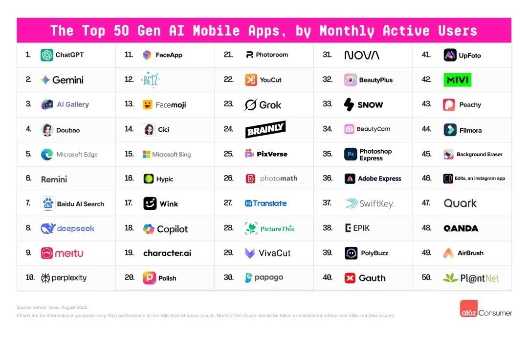 与之对比,全球 AI 应用市场上,众多细分赛道则相对活跃。从 A16Z 最新发布的一份 《全球百强 AI 消费者应用榜单》 第五版可见,除了几个 「老面孔」 覆盖了几乎所有高频场景—学习、陪伴、设计、生产力、社区,作为 「黑马」 的几款产品来自不同的领域。比如主打氛围编程的 Lovable 直接冲到第 22 位,Suno 首次把音乐生成带入主榜。