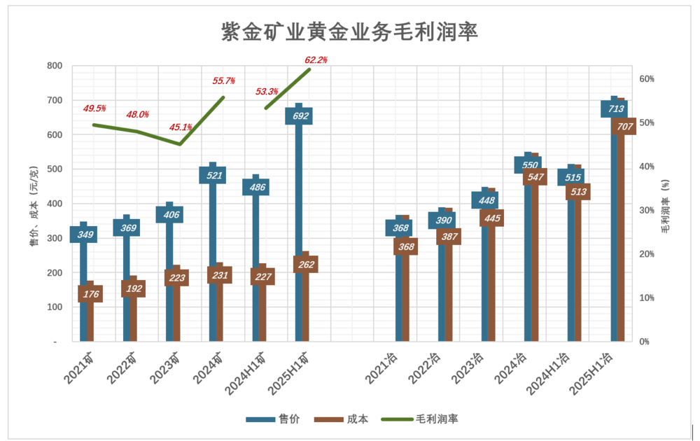 2025 年 H1,矿产金售价进一步提高到 692 元/克,成本亦增至 262 克/元,毛利润率 62.2%;冶炼金售价、成本分别为 713 元/克、707 元/克,毛利润率 0.84%;