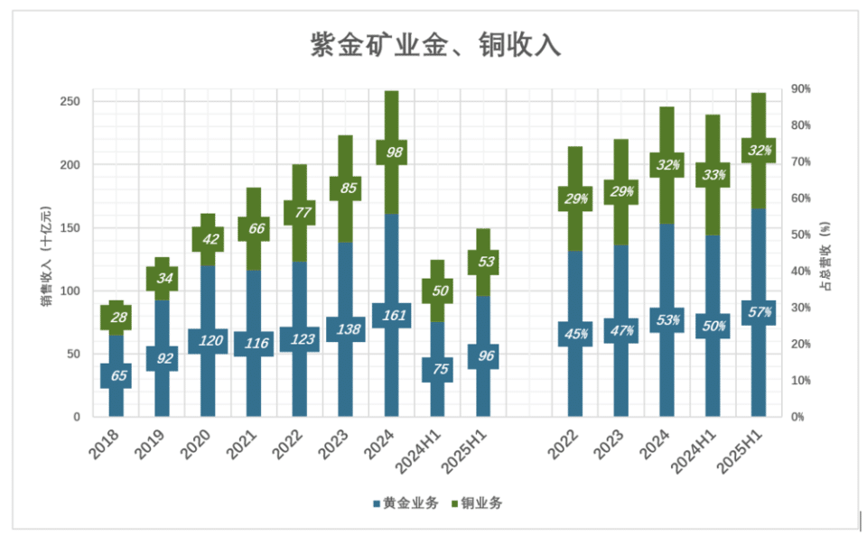 2025 年 H1,黄金、铜业务收入分别为 959 亿、533 亿,分别占总营收的 57.2%、31.8%;