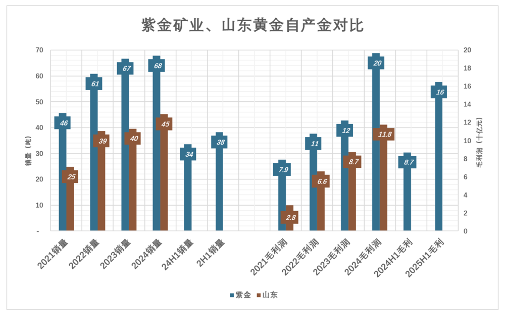 到 2024 年,山东黄金矿山产金销量达 67.8 吨,山东黄金自采销量 45.2 吨,相当于紫金的 66.7%;毛利润 118 亿、相当于紫金的 60%。