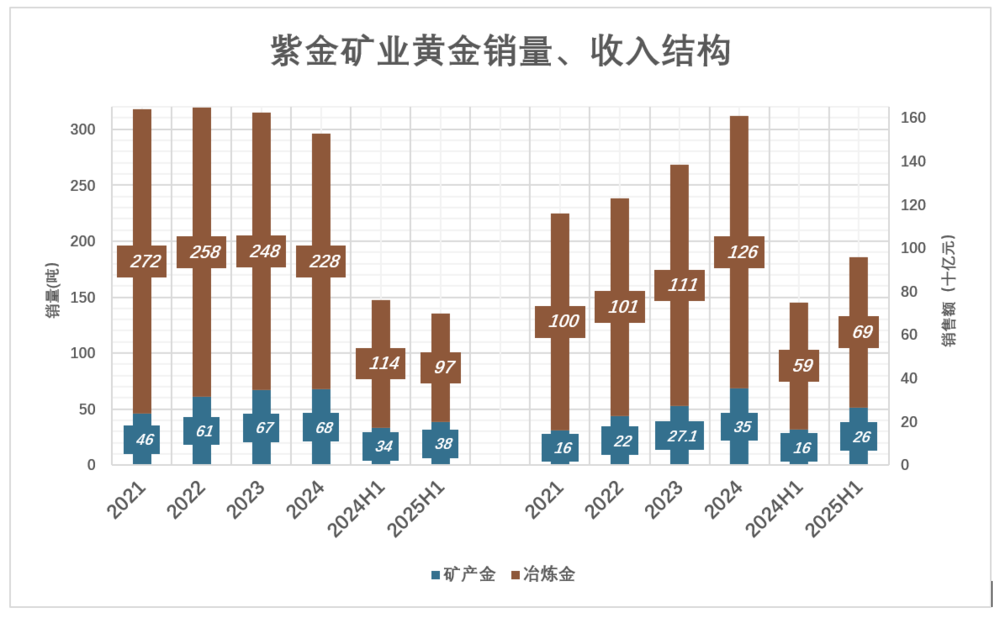 2025 年 H1,矿产金、冶炼金销量分别为 38 吨、997 吨,矿产金占比 28.2%;销售额分别为 265 亿、694 亿,矿产金占比 27.6%;