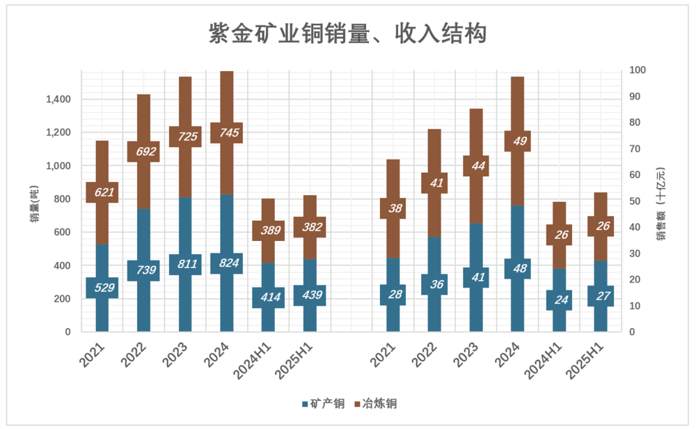 2025 年 H1,矿产铜、冶炼铜销量分别为 43.9 万吨、38.2 万吨,矿产铜占 53.5%;销售额分别为 273 亿、261 亿,矿产铜占比 51.1%;