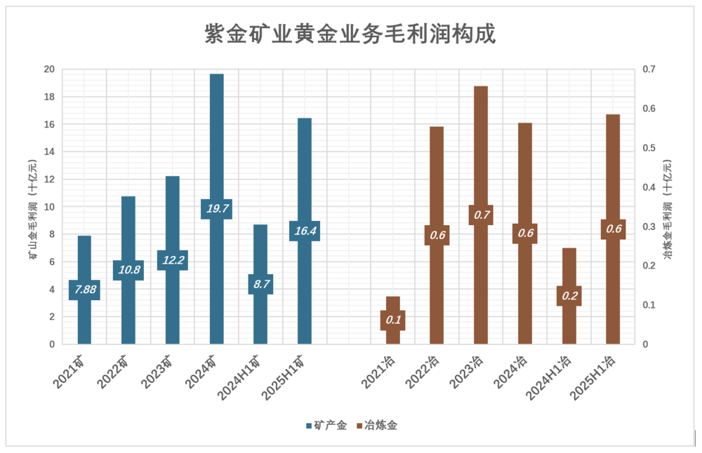 2024 年,矿产金销售额 353 亿、毛利润 197 亿;冶炼金销售额高达 1255 亿 (占总营收的 41.3%)、毛利润仅 5.6 亿,占黄金业务毛利润的 1.8%。