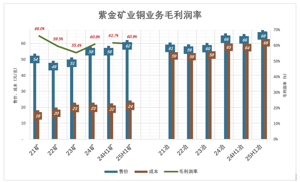 2025 年 H1,矿产铜售价进一步提高到 6.21 万元/吨,毛利润率 60.9%;冶炼铜售价、成本分别 6.83 万元/吨、6.76 万元/吨,毛利润率 1.1%;