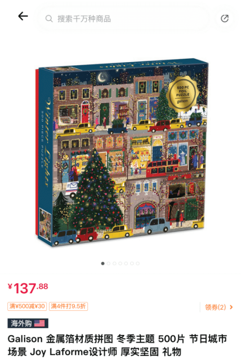 丢丢女士在 2024 年 11 月 6 日下单一盒热销品 Galison 冬灯拼图,500 片,售价 137 元。她原计划在圣诞节之前完成拼装,并打算 「拼完以后裱起来挂在卧室」。