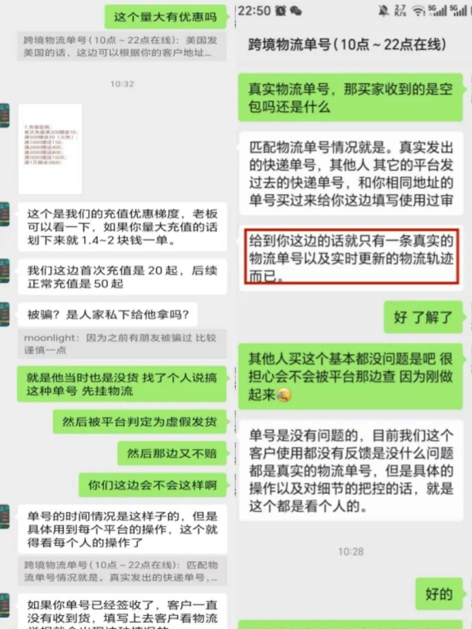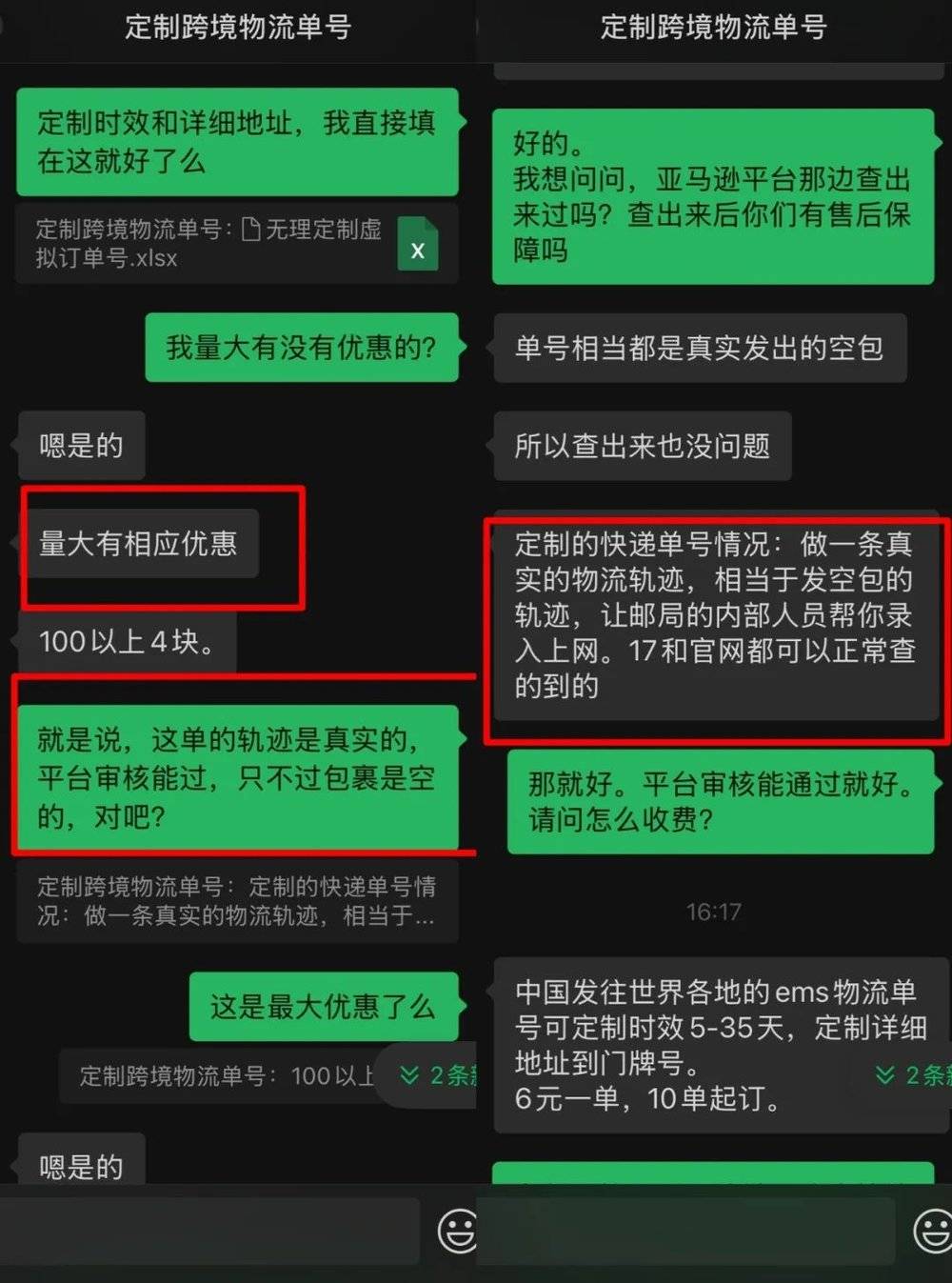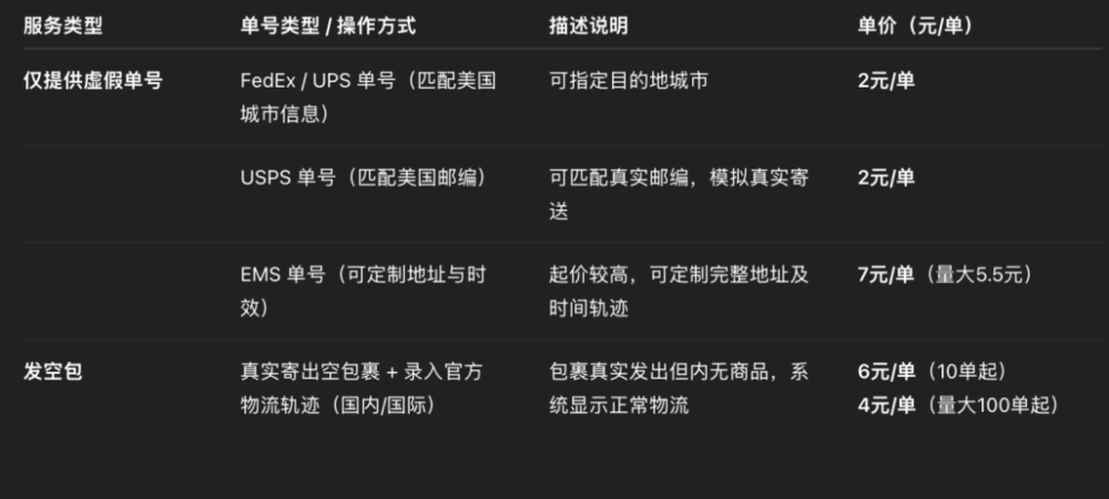 我们以新卖家的身份,联系上一家主营跨境快递的货代公司。当我们表示 「商品还没备好,但需要一个物流信息挂上系统」 时,对方并未表现出惊讶,只问:「挂哪国的?要不要配邮编?」 并且追问说:「空包也能做,就是比挂单号贵点。」 他向我们提供了两种 「方案」:一种是生成真实物流轨迹但不实际发货;另一种是真正寄出一个空的快递包裹。