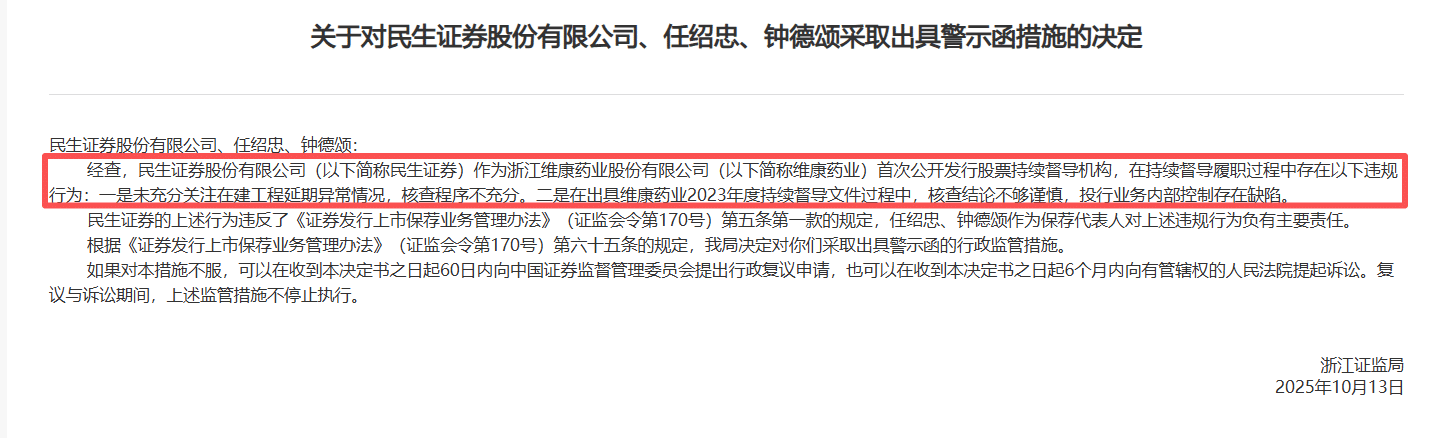 民生证券 10 月 21 日收到的警示函,与维康药业 7 月 10 日收到的行政处罚决定书存在直接且紧密的关联。二者本质上是监管层对 「维康药业信息披露违法案」 全链条追责的两个关键环节,前者聚焦中介机构 (民生证券) 的持续督导失职,后者针对上市公司 (维康药业) 及相关责任人的违法主体行为,共同构成 「发行人违法+中介失职」 的完整监管闭环。