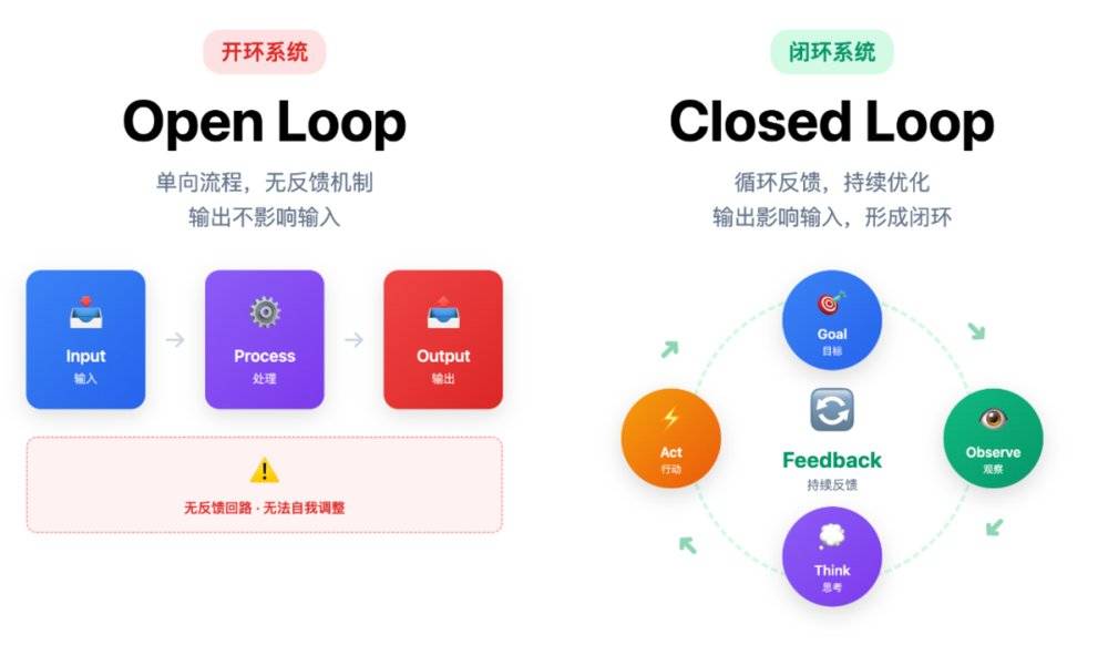 为了理解 Agent 的有效性,我们首先要区分两种根本不同的系统:开环系统 (Open-loop System)与闭环系统 (Closed-loop System)