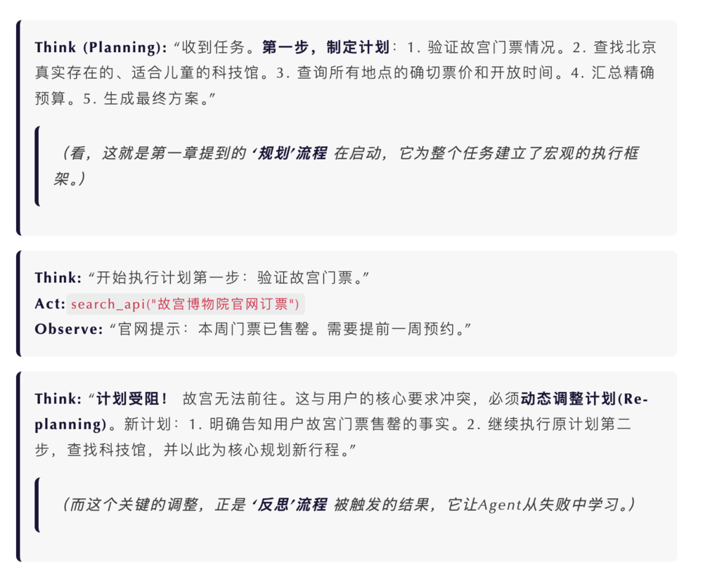 让我们回到那个旅行规划的例子。当 Agent 通过工具查询后,得知 「故宫门票售罄」 时,Reflexion 流程被触发了。它做了什么?