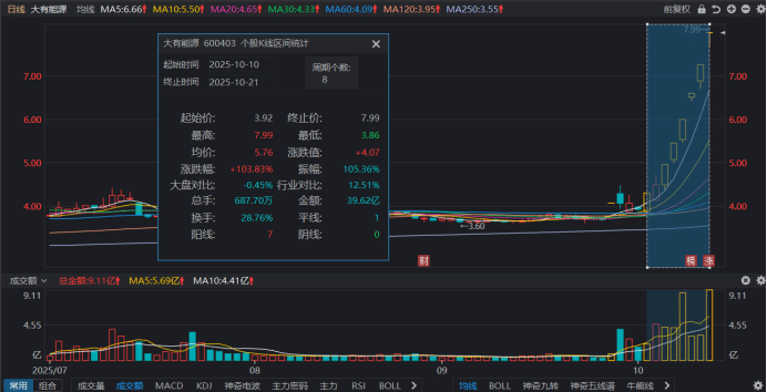 财联社 10 月 21 日讯 (编辑 梓隆),今日 (10 月 21 日),市场热股大有能源再获涨停,截至收盘,其成功晋级 6 连板,为目前最高连板标的。同时,大有能源近 8 个交易日累计上涨近 103.8%,不计算新股情况,其成为首只本月翻倍股。