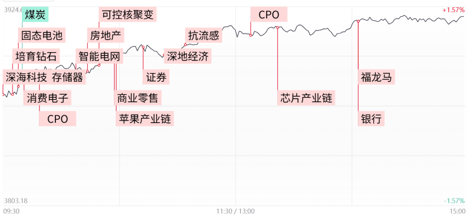 财联社 10 月 21 日讯,市场震荡反弹,创业板指涨超 3%,沪指涨 1.36% 重返 3900 点。沪深两市成交额 1.87 万亿,较上一个交易日放量 1363 亿。盘面上,市场热点轮番活跃,全市场超 4600 只个股上涨。深地经济概念持续走强,神开股份、石化机械双双 2 连板。CPO 概念股全天走强,「易中天」 光模块三巨头震荡拉升,源杰科技触及 20cm 涨停创历史新高。苹果产业链表现活跃,环旭电子涨停,工业富联大涨。下跌方面,煤炭股走弱,安泰集团大跌。截至收盘,沪指涨 1.36%,深成指涨 2.06%,创业板指涨 3.02%。