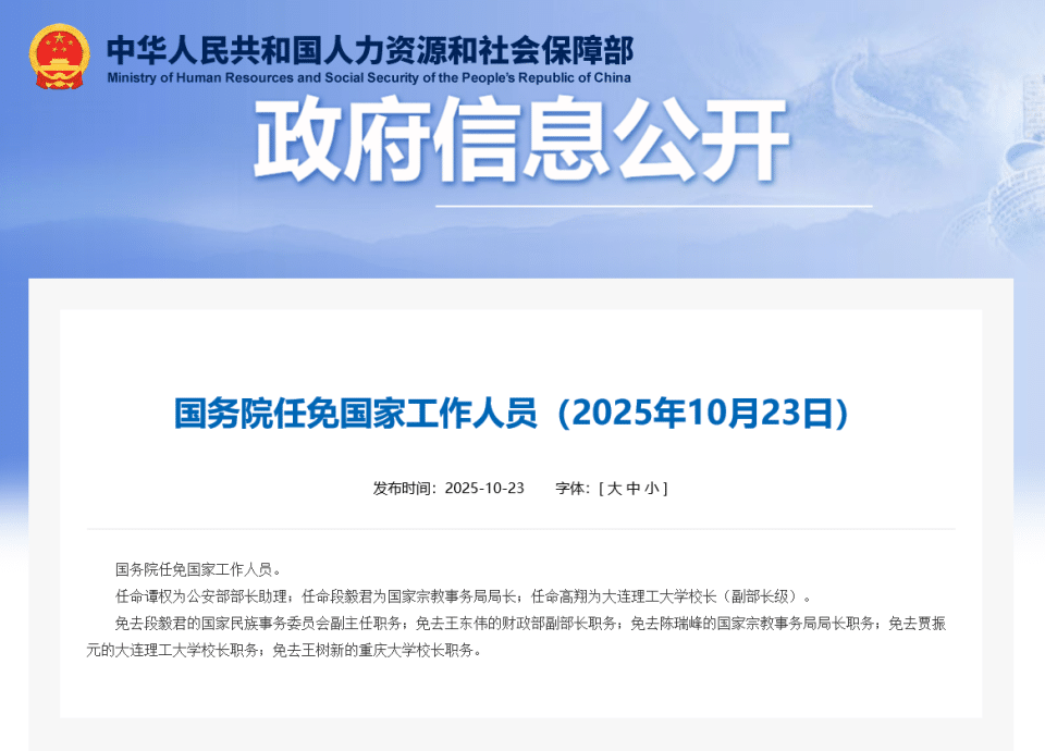 商业动态国务院任免国家工作人员:谭权任公安部部长助理 2025 年 10 月 24 日2025 年 10 月 24 日0 文章来源:财联社 财联社 10 月 23 日讯,据人社部网站消息,国务院任免国家工作人员。任命谭权为公安部部长助理;任命段毅君为国家宗教事务局局长;任命高翔为大连理工大学校长 (副部长级)。 免去段毅君的国家民族事务委员会副主任职务;免去王东伟的财政部副部长职务;免去陈瑞峰的国家宗教事务局局长职务;免去贾振元的大连理工大学校长职务;免去王树新的重庆大学校长职务。