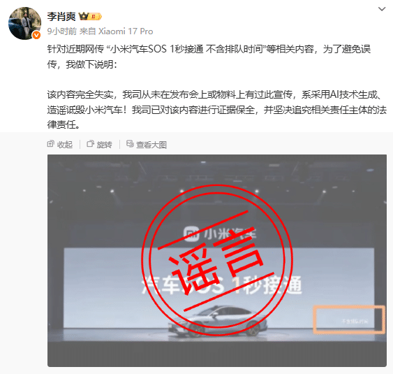 商业动态小米汽车副总裁李肖爽否认宣传 「SOS 1 秒接通」:系造谣诋毁 将追责 2025 年 10 月 24 日2025 年 10 月 24 日0 文章来源:财联社 财联社 10 月 23 日讯,针对近期网传 「小米汽车 SOS 1 秒接通,不含排队时间」 等相关内容,小米汽车副总裁李肖爽在微博发文称:该内容完全失实,公司从未在发布会上或物料上有过此宣传,系采用 AI 技术生成、造谣诋毁小米汽车。公司已对该内容进行证据保全,并坚决追究相关责任主体的法律责任。