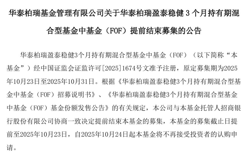 10 月 23 日盘后,华泰柏瑞基金发布公告称,华泰柏瑞盈泰稳健 3 个月持有混合 (FOF) 原定募集期为 10 月 23 日至 10 月 31 日,基金管理人与基金托管人招商银行协商一致决定提前结束该基金的募集,募集截止日提前至 10 月 23 日,自 10 月 24 日起不再接受投资者的认购申请。