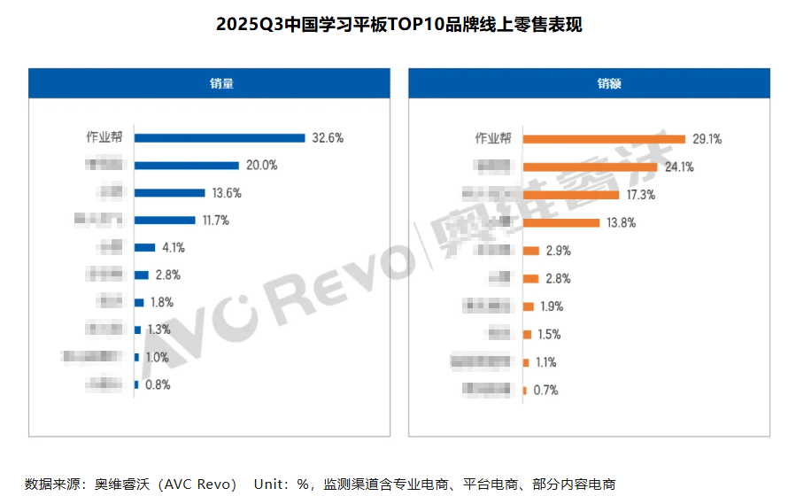 近日,市场调研机构奥维睿沃发布最新一期 《中国学习平板线上零售月度数据报告》。报告显示,2025 年第三季度,中国学习机线上市场销量同比增长 48.3%,延续上半年的强劲势头。其中,作业帮学习机以 32.6% 的销量占比和 29.1% 的销额占比稳居全行业第一。