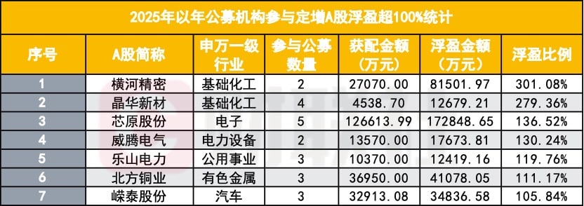 大体量项目中也不乏亮眼表现。芯原股份获 5 家公募机构定增参与,合计获配金额 12.66 亿元,目前浮盈金额为 17.28 亿元,浮盈比例达 136.52%。AI 赛道龙头寒武纪也吸引 8 家公募参与定增,尽管目前浮盈比例仅为 19.62%,但合计浮盈金额已接近 5 亿元。这些数字不仅反映了资金的偏好,更显示出公募在行业趋势上的前瞻性布局。