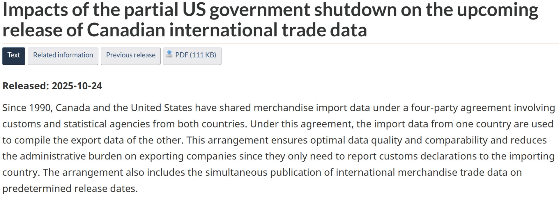 同样定于 11 月 4 日发布的加拿大国际服务贸易数据也受到影响。加拿大统计局解释称,完整的货物贸易数据,以及其他美国政府部门的数据,都是服务贸易数据的重要输入项。