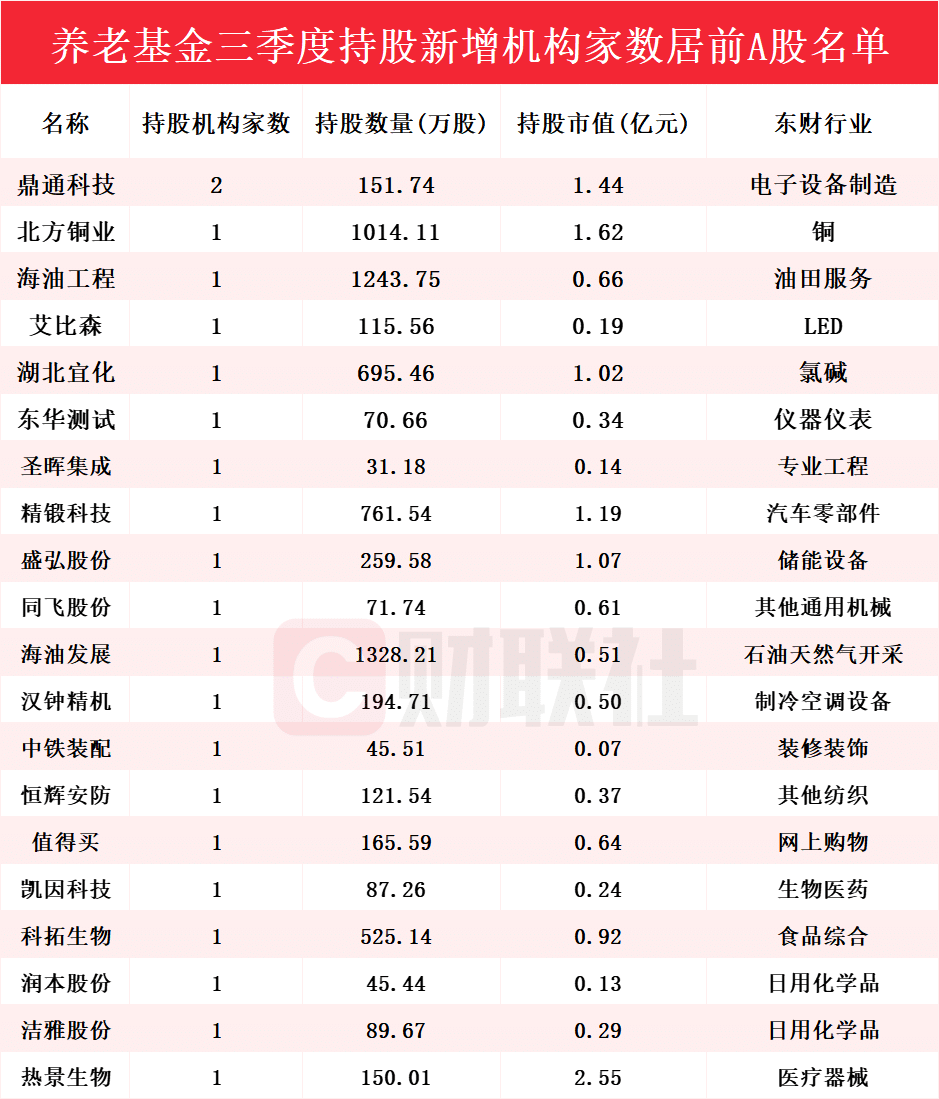 其中,鼎通科技新增养老基金持股家数最多,达到 2 家。此外,北方铜业、海油工程、艾比森、湖北宜化、东华测试、圣晖集成、精锻科技、盛弘股份、同飞股份、海油发展、汉钟精机、中铁装配、恒辉安防、值得买、凯因科技、科拓生物、润本股份、洁雅股份和热景生物新增养老基金持股家数均达到 1 家。具体情况如下图:
