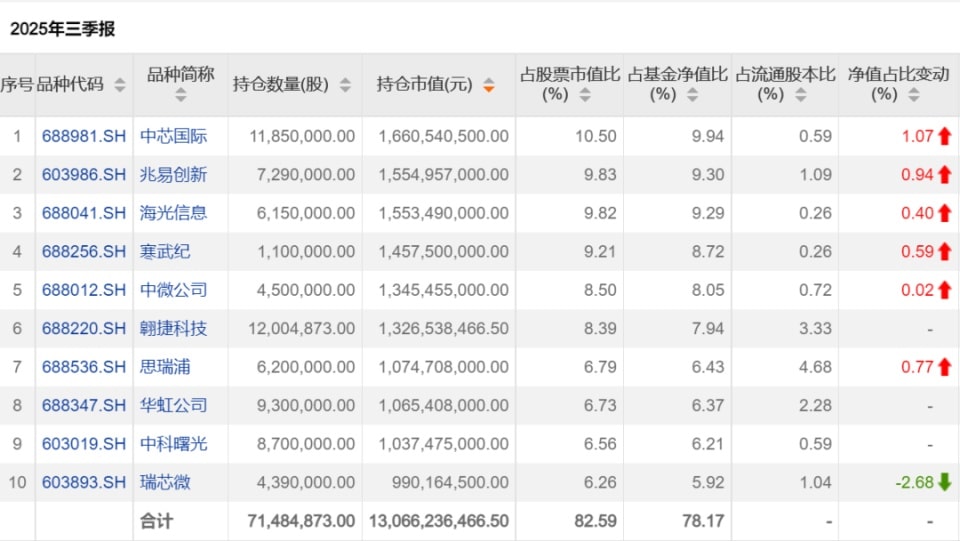 多只绩优基金三季度保持高仓位运作。具体来看,截至三季度末,郑巍山管理的银河创新成长混合基金的权益投资占基金资产净值比例为 94.65%。三季度,银河创新成长混合基金对半导体产业链细分结构进行了适当调整。从该基金前十大重仓股来看,翱捷科技、华虹公司中科曙光成为基金新进前十大重仓股。