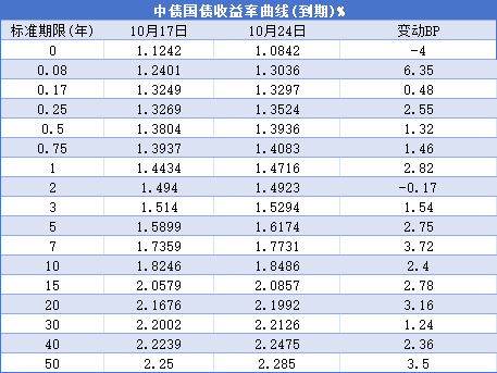 2025 年 10 月 24 日,中债国债到期收益率 1 年期、2 年期、3 年期、5 年期、7 年期、10 年期、30 年期、50 年期较 2025 年 10 月 17 日分别变动 2.82BP、-0.17BP、1.54BP、2.75BP、3.72BP、2.4BP、1.24BP、3.5BP。