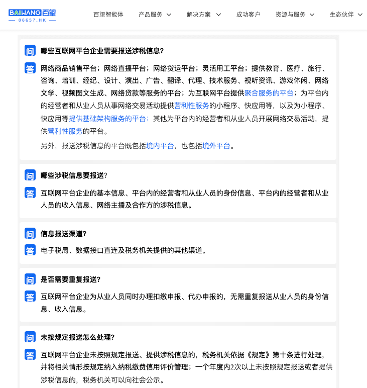 百望股份表示,互联网平台涉税信息报送需要及时、准确、完整,百望股份为企业提供一站式涉税信息报送解决方案,支持与电子税务局和乐企平台对接,通过标准化的流程与数据接口,保障数据安全的基础上,简化报送操作,缩短整体报送周期,规范报送行为,助力企业轻松应对监管要求。