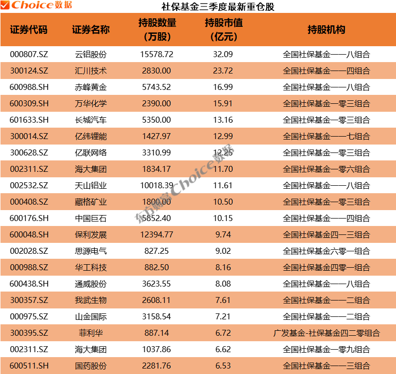 其中,全国社保基金一一八组合持有云铝股份1.56 亿股,持股市值 32.09 亿元,还持有赤峰黄金16.99 亿元、天山铝业11.61 亿元;全国社保基金一一四组合持有汇川技术2830 万股,持股市值 23.72 亿元;全国社保基金一零三组合持有万华化学15.91 亿元。