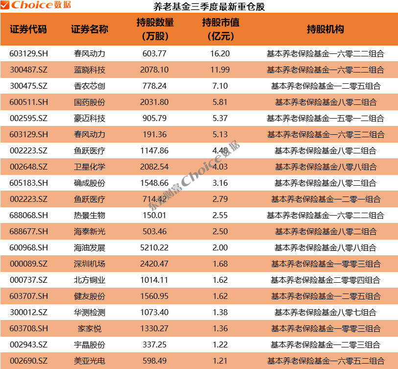 在已公布 2025 年三季报的上市公司中,养老基金持股市值最高的个股是春风动力,养老金一六零二二组合、一六零三二组合分别持有 603.77 万股、191.36 万股,持股市值 16.20 亿元、5.13 亿元;其次是蓝晓科技,一六零二二组合持有 2078.1 万股,持股市值 11.99 亿元。此外,一二零五组合持有香农芯创7.1 亿元,八零二组合持有国药股份5.81 亿元。