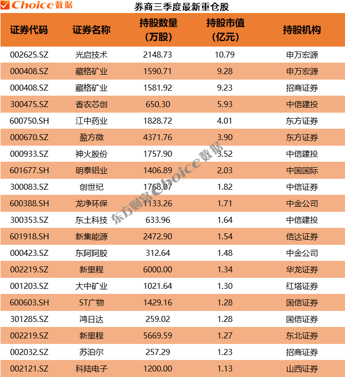 在已公布 2025 年三季报的上市公司中,申万宏源、招商证券分别持有藏格矿业 1590.71 万股、1581.92 万股,持股市值 9.28 亿元、9.23 亿元;申万宏源还持有光启技术10.79 亿元。中信建投、东方证券分别持有香农芯创、江中药业5.93 亿元、4.01 亿元。