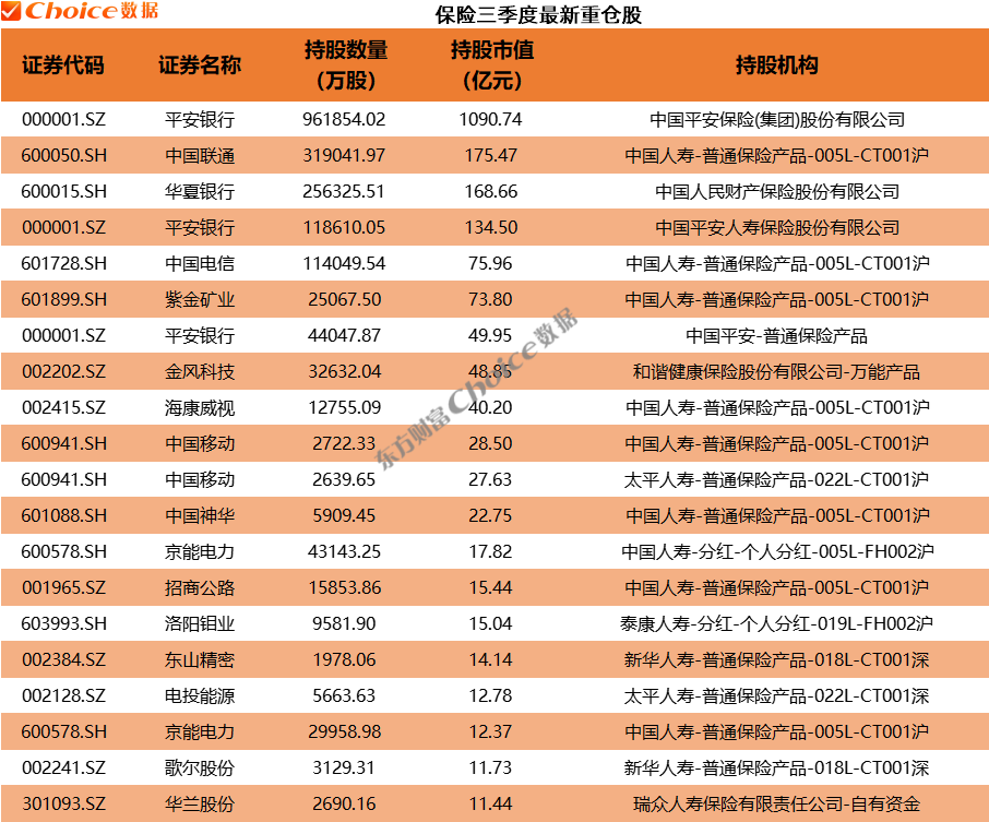 紫金矿业、金风科技、海康威视等被保险持有市值均超 40 亿元。