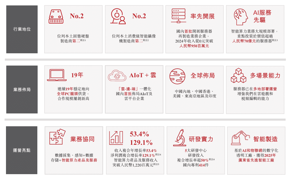 根据弗若斯特沙利文的资料,2024 年,按 SSD 收入计,公司是全球市场为第二大国内智慧存储设备制造商;按出货量计,是全球市场第二大国内消费级智能摄像机制造商,占有 6.6% 的市场份额。