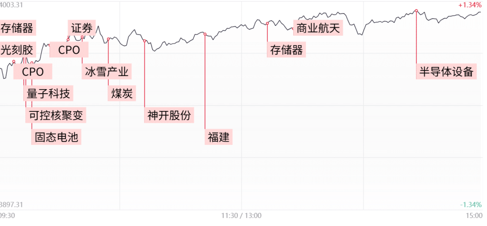财联社 10 月 27 日讯,市场震荡上涨,沪指高开高走涨超 1%,再创十年新高,盘中逼近 4000 点。沪深两市成交额 2.34 万亿,较上一个交易日放量 3659 亿。盘面上,市场热点轮番活跃,存储芯片概念股全天走强,德明利 2 连板创新高,江波龙、香农芯创等多只个股创新高,时空科技 4 连板。算力硬件概念股延续强势,汇绿生态 6 天 4 板创新高,新易盛、中际旭创盘中均创历史新高。核电板块表现活跃,东方钽业 3 天 2 板,安泰科技等多股涨停。下跌方面,风电板块集体走弱,海力风电大跌。截至收盘,沪指涨 1.18%,深成指涨 1.51%,创业板指涨 1.98%。