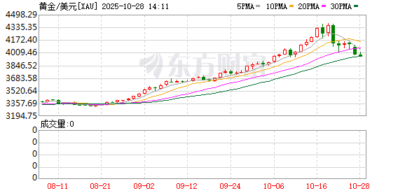 北京时间 10 月 27 日晚,现货黄金一路走低,向下跌破 4000 美元/盎司,为 10 月 10 日以来首次,日内跌幅扩大至 2.75%。