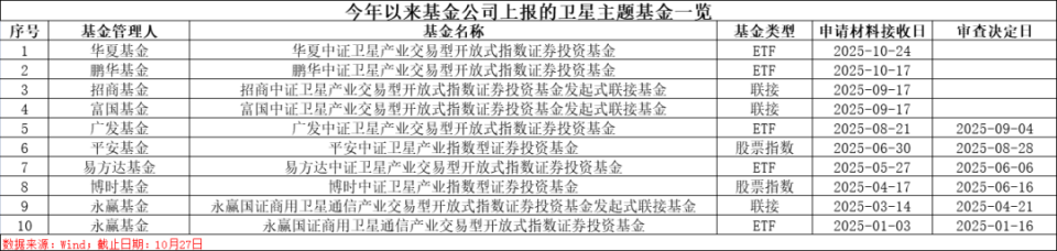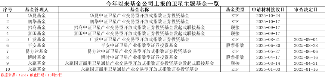进入四季度,布局节奏进一步加快:10 月 17 日鹏华中证卫星产业 ETF、10 月 24 日华夏中证卫星产业 ETF 相继提交申报材料;10 月 27 日,易方达中证卫星产业 ETF 正式启动认购,博时中证卫星产业指数基金也在同步募集中。