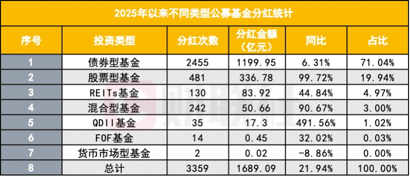 财联社 10 月 28 日讯 (记者 吴雨其)如果说 2025 年市场的关键词是震荡中的回暖,那在公募基金领域,分红无疑是一个最具存在感的注脚。根据公募排排网数据,截至 10 月 27 日,今年以来公募基金累计分红 3359 次,总金额高达 1689.09 亿元,较去年同期增长 21.94%。