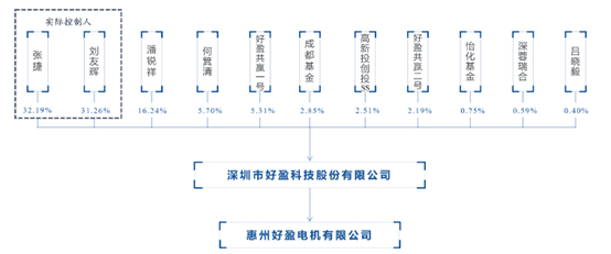 截至招股说明书签署日,张捷直接持有公司 32.19% 的股份,作为好盈共赢一号执行事务合伙人间接控制公司 5.31% 的表决权,作为好盈共赢二号执行事务合伙人间接控制公司 2.19% 的表决权;刘友辉直接持有公司 31.26% 的股份。张捷、刘友辉二人合计控制公司 70.95% 的表决权,共同作为公司的控股股东和实际控制人。