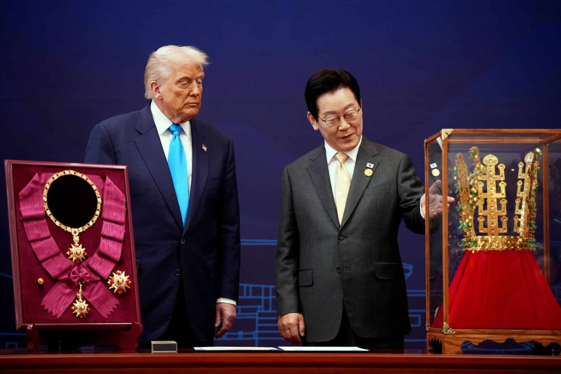 韩国总统李在明将一顶在庆州国立博物馆展出的金冠复制品赠送给了特朗普。韩国政府还授予特朗普韩国政府最高荣誉——木槿花勋章,以赞誉他为促进和平所做的努力。