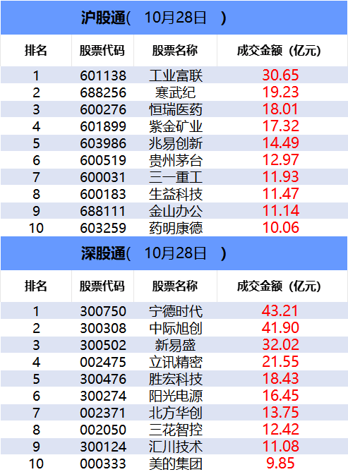 从沪股通前十大成交个股来看,工业富联位居首位;寒武纪和恒瑞医药分居二、三位。