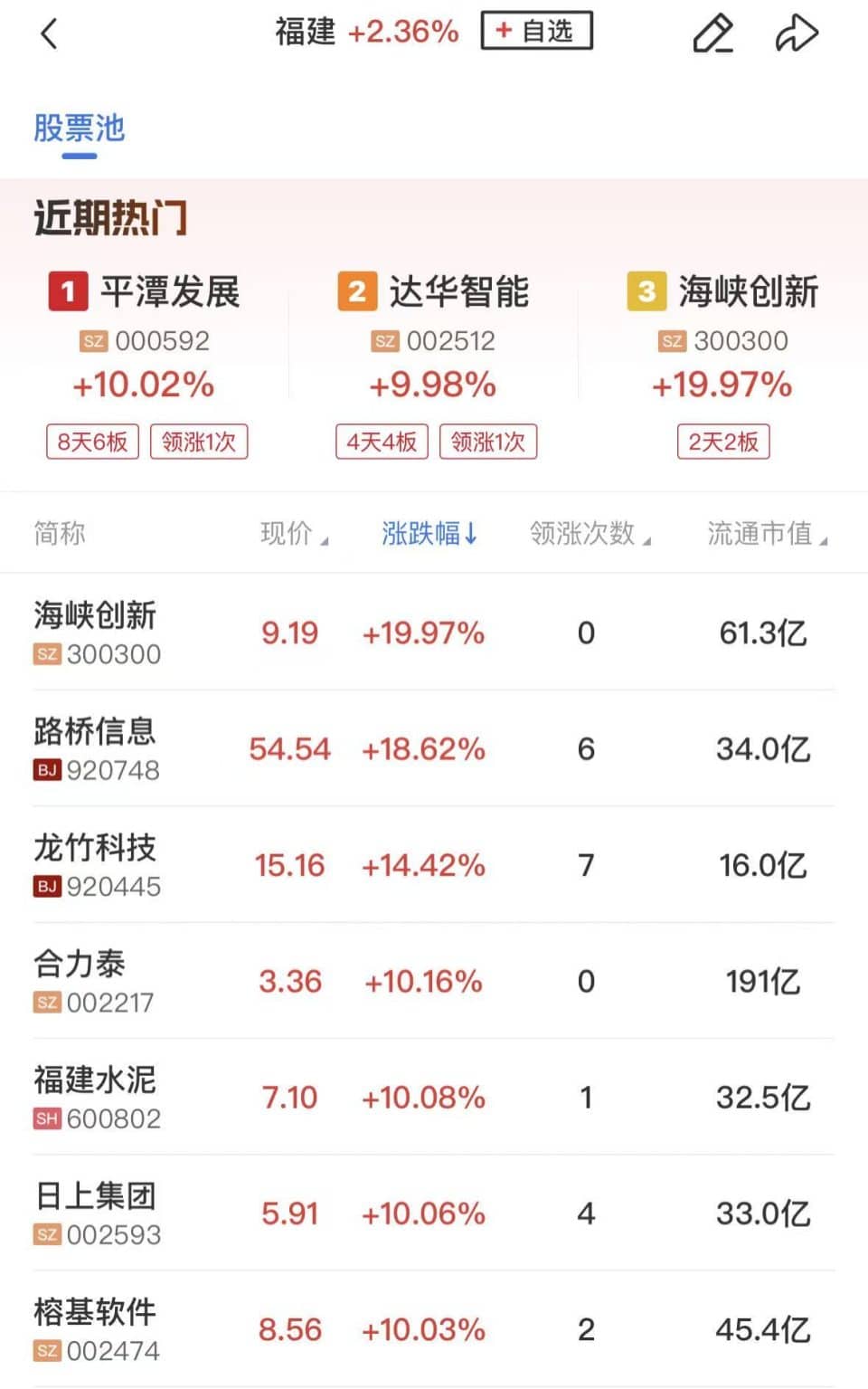 个股来看,今日早盘涨停数量为 49 家 (不包括 ST 及未开板新股),封板率为 83%,连板股数量为 12 家,盈新发展 7 连板,平潭发展、达华智能、时空科技 4 连板,青岛双星、大为股份、亚士创能 3 连板,东方钽业、安泰科技、海峡创新、福建水泥、景旺电子 2 连板。