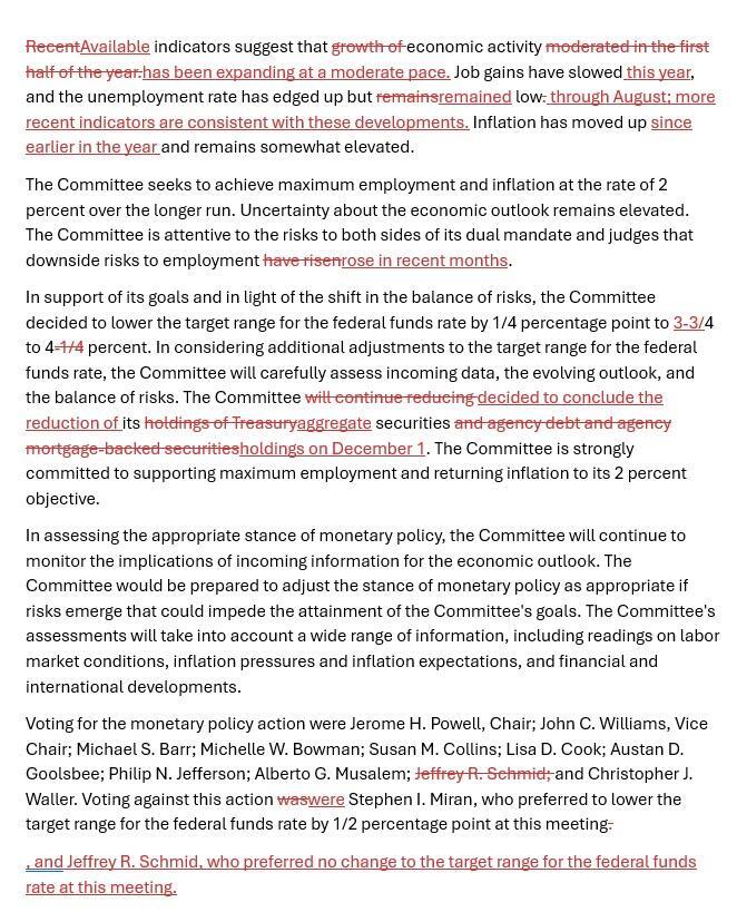 尽管会议声明措辞有所调整,但主要突出联邦政府 10 月持续关门导致经济数据推迟发布的影响。声明指出,就业下行风险 「在最近几个月上升」,暗示政府关门期间替代性劳动力指标仍显疲软;同时承认经济活动以 「温和速度扩张」,反映二季度 GDP 上修及居民消费稳健。整体来看,声明其他内容变化有限。