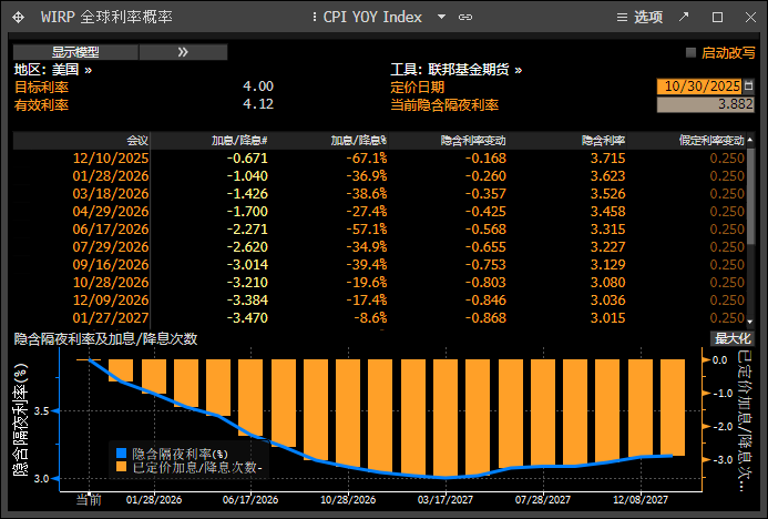鲍威尔发言后,市场押注美联储降息 12 月降息的概率从 91% 回落至 67%。其鹰派的表态,更像是引导市场预期修正,此前市场的疯狂押注表表明,市场已几乎完全消化今年内合计降息三次的预期。如今,鲍威尔的发言表明 12 月实施降息的门槛已进一步抬高。