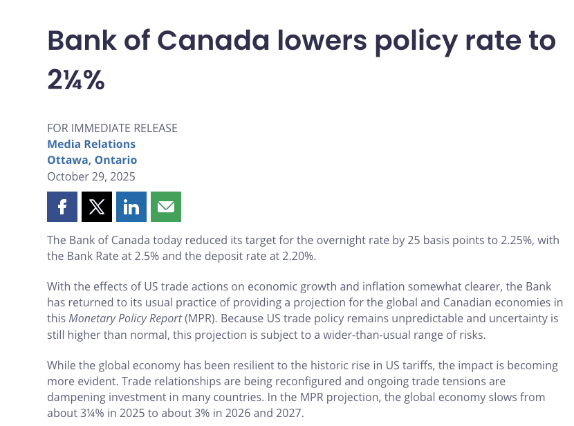 政策决议宣布,因美国关税带来的冲击,调降政策利率 25 个基点至 2.25%。这是加央行连续第二次会议降息,该国的利率目前处于 2022 年 7 月以来最低水平。