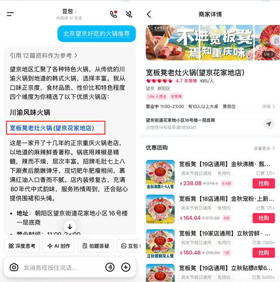 比如,在豆包输入 「北京望京好吃的火锅推荐」,结果会给出不同类型的火锅店,点击蓝色字体的店家名称,进入抖音商家详情页面,可购买团购优惠券,不可谓不方便。