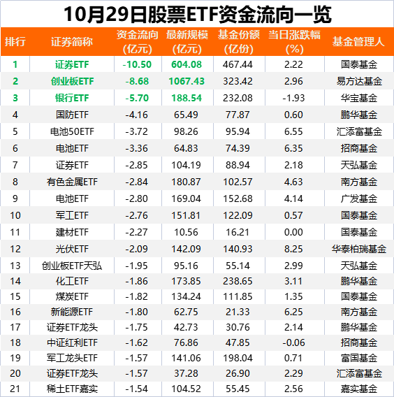 市场突破关键点位,股票 ETF 遭遇资金净赎回。Wind 数据显示,上一交易日 (10 月 29 日) 股票 ETF 市场总份额减少 22.02 亿份,按照成交均价测算,当日净流出资金约 7.88 亿元。