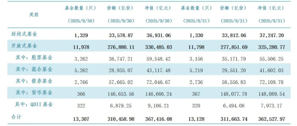 股票型基金方面,资金流入和新产品发行推动其总份额实现显著增长。9 月底,该类基金的总份额为 3.67 万亿份,与 8 月底的 3.52 万亿份相比增长 1575 亿份。