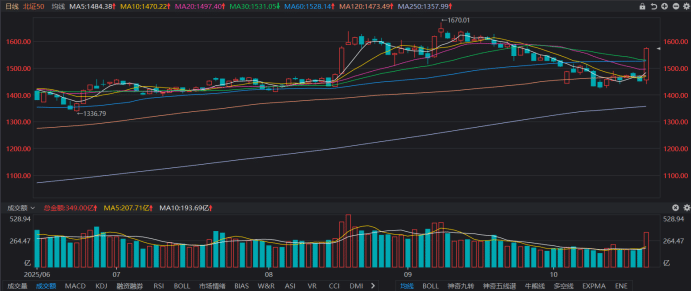 财联社 10 月 29 日讯 (编辑 梓隆),今日 (10 月 29 日),北证 50 指数迎来长阳大涨,截至收盘,其全天涨幅达 8.41%,收盘点位再次站上 1500 点,并创近 1 个月以来新高。若以年内行情统计,北证 50 指数今年以来的涨幅达 51.6%,超越科创 50(50.58%)。