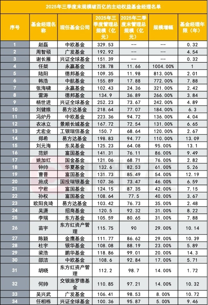 (原标题:百亿主动权益基金经理快速扩容!增至 109 位,有的规模单季增长超 10 倍)